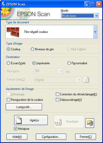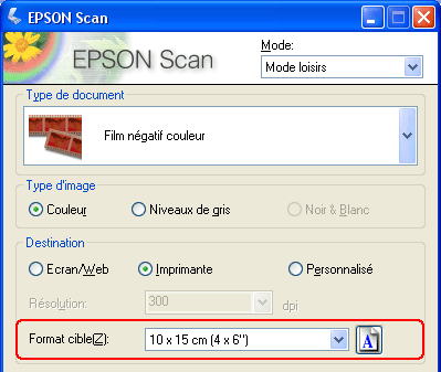 Si vous souhaitez numériser les images au format original ou selon un format plus petit et que vous ne souhaitez pas les agrandir par la suite, vous pouvez accepter le paramètre Résolution sélectionné par Epson Scan en fonction du paramètre Destination défini (Mode loisirs uniquement).
