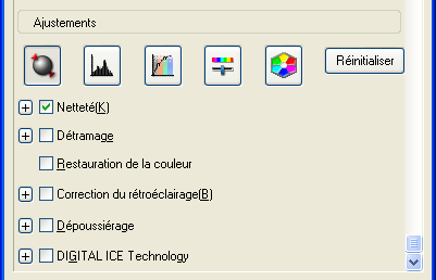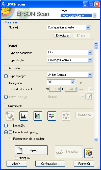Ajustement des paramètres relatifs aux couleurs et à l'imageUne fois les images affichées en aperçu et la zone de numérisation ajustée, vous pouvez modifier la qualité de l'image, si nécessaire. Epson Scan propose une gamme de paramètres permettant d'optimiser la couleur, la netteté, le contraste et les autres aspects affectant la qualité de l'image.