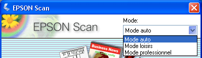 Activation d'un autre mode de numérisationPour activer un autre mode de numérisation, cliquez sur la flèche de la zone Mode située dans le coin supérieur droit de la fenêtre de Epson Scan. Sélectionnez ensuite le mode que vous souhaitez utiliser dans la liste qui s'affiche.