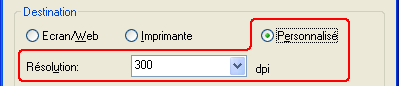Sélection de la résolution de numérisationEn Mode loisirs, vous ne pouvez modifier la résolution que si vous sélectionnez l'option Personnalisé pour le paramètre Destination.