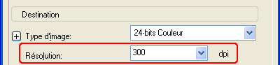 Si vous envisagez d'agrandir les images par la suite à l'aide d'un programme de retouche des images, vous devez augmenter le paramètre Résolution de manière à conserver une qualité d'image importante après agrandissement. Augmentez la résolution de manière conforme à l'augmentation appliquée au niveau de la taille de l'image. Par exemple, si la résolution est de 300 ppp (points par pouce) et que vous augmentez la taille de l'image de 200 % dans un programme de retouche des images, sélectionnez 600 ppp pour le paramètre Résolution dans Epson Scan. Cliquez sur la flèche située à côté de la liste Résolution et sélectionnez le nombre de points par pouce que vous souhaitez utiliser dans le cadre de la numérisation. Reportez-vous au tableau ci-dessous pour obtenir quelques directives.
