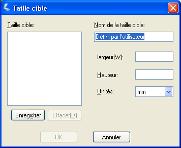 ![]() Saisissez le nom de la taille personnalisée sélectionnée, saisissez la taille, cliquez sur le bouton Enregistrer, puis sur OK. La nouvelle taille apparaît dans la liste Taille cible.