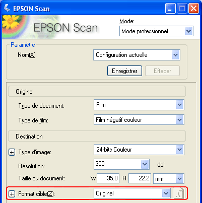 Paramètres Original. Ces paramètres permettent à Epson Scan d'identifier le type de film ou de diapositive numérisé.
