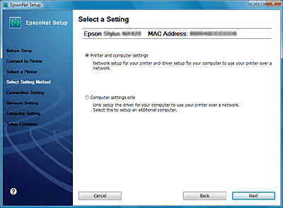 Au niveau de l'écran Select Settings (Sélectionner les paramètres), sélectionnez Printer and computer settings (Paramètres de l'imprimante et de l'ordinateur) et cliquez sur Next (Suivant).