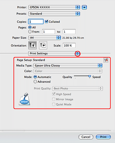 Select the appropriate Media Type, Color, and Mode settings. See the online help for more details on Print Settings.