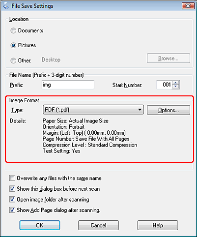Full Auto Mode: Select PDF as the Image Type setting in the File Save Settings window. See Scanning in Full Auto Mode for instructions. If you want to scan multiple document pages into one PDF file serially, change the scan mode to Home Mode or Professional Mode. See Changing the Scan Mode for instructions.