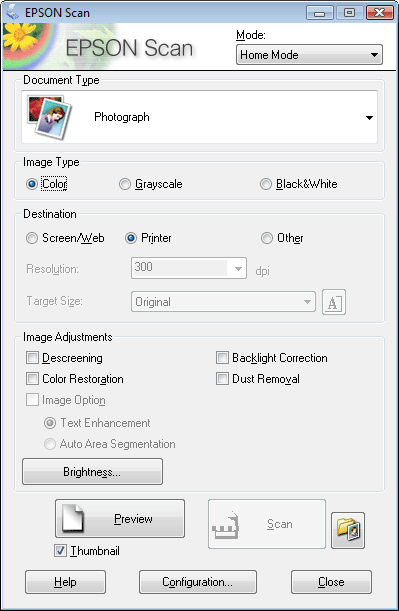 When you select Home Mode, you see the Epson Scan Home Mode window.