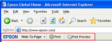 Une fois EPSON Web-To-Page installé, la barre de menus correspondante s'affiche dans la Toolbar (Barre d'outils) Microsoft Internet Explorer. Si ce n'est pas le cas, sélectionnez Toolbars (Barres d'outils) dans le menu View (Affichage) de Internet Explorer et sélectionnez ensuite EPSON Web-To-Page.