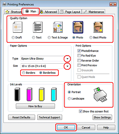 Cliquez sur l'onglet Main (Principal) et sélectionnez une des options suivantes pour la qualité dans Quality Option (Option Qualité) :