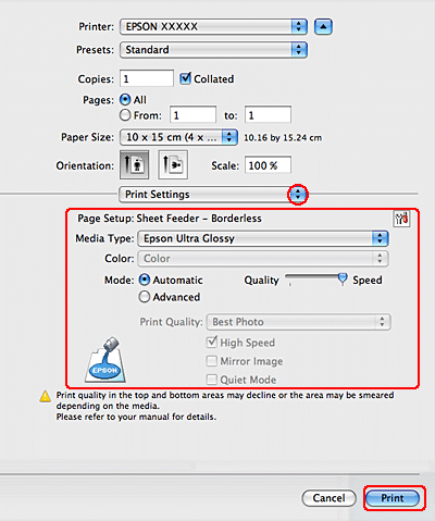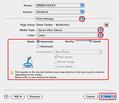 Sélectionnez les paramètres Media Type (Support), Color (Couleur) et Mode adaptés. Pour plus de détails sur l'option Print Settings (Configuration Imprimante), reportez-vous à l'aide en ligne.