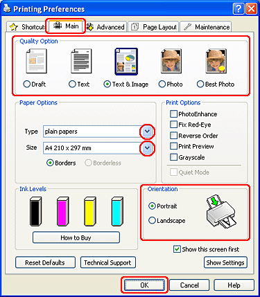 Cliquez sur l'onglet Main (Principal) et sélectionnez une des options suivantes pour la qualité dans Quality Option (Option Qualité) :
