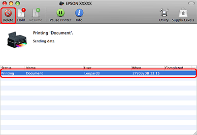 Cliquez sur le bouton Delete (Effacer) pour annuler le travail d'impression.