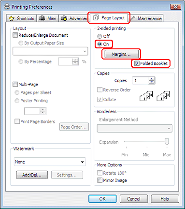 Cliquez sur l'onglet Page Layout (Disposition), puis sélectionnez On (Oui) sous 2-sided printing (Impression recto verso). Activez ensuite la case à cocher Folded Booklet (Livret plié).