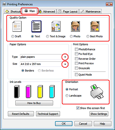 Cliquez sur l'onglet Main (Principal) et sélectionnez une des options suivantes pour la qualité dans Quality Option (Option Qualité) :