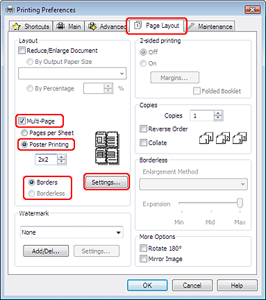 Cliquez sur l'onglet Page Layout (Disposition), sélectionnez Multi-Page (Multi-Pages), puis sélectionnez Poster Printing (Impression poster). Cliquez sur la flèche Haut ou Bas pour sélectionner 2x1, 2x2, 3x3 ou 4x4.