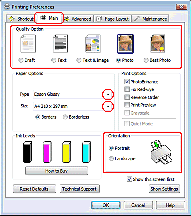 Cliquez sur l'onglet Main (Principal) et sélectionnez une des options suivantes pour la qualité dans Quality Option (Option Qualité) :