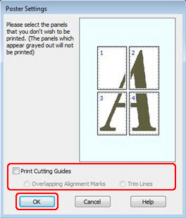 Voici un exemple de création de poster pour lequel on sélectionne l'option 2x2 dans la zone Poster printing (Impression poster) et l’option Overlapping Alignment Marks (Guides de recouvrement) dans la zone Print Cutting Guides (Imprimer les marques de coupe).