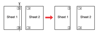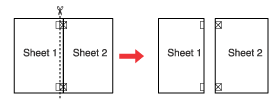 Coupez les feuilles assemblées le long de la ligne verticale raccordant les repères d'alignement (cette fois, une ligne située à gauche des repères) :