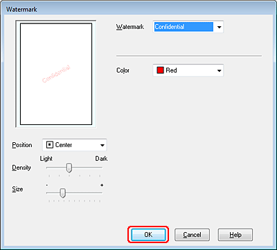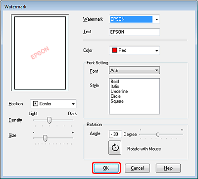 Assurez-vous que le filigrane souhaité est sélectionné dans la liste Watermark (Filigrane), puis sélectionnez les paramètres Color (Couleur), Position, Density (Densité), Size (Taille), Font (Police), Style et Angle. (pour plus de détails, reportez-vous à l’aide en ligne). Les paramètres définis sont visibles dans la fenêtre d'aperçu.