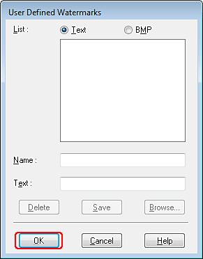Cliquez sur le bouton Add/Del (Personnalisé) sous Watermark (Filigrane) de la fenêtre Page Layout (Disposition). La fenêtre ci-dessous s’affiche.