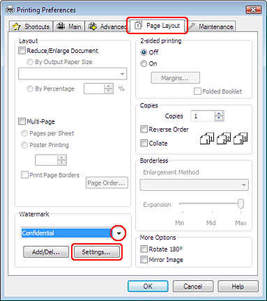 Cliquez sur l'onglet Page Layout (Disposition), choisissez le filigrane souhaité dans la liste Watermark (Filigrane), puis cliquez sur Settings (Configuration).