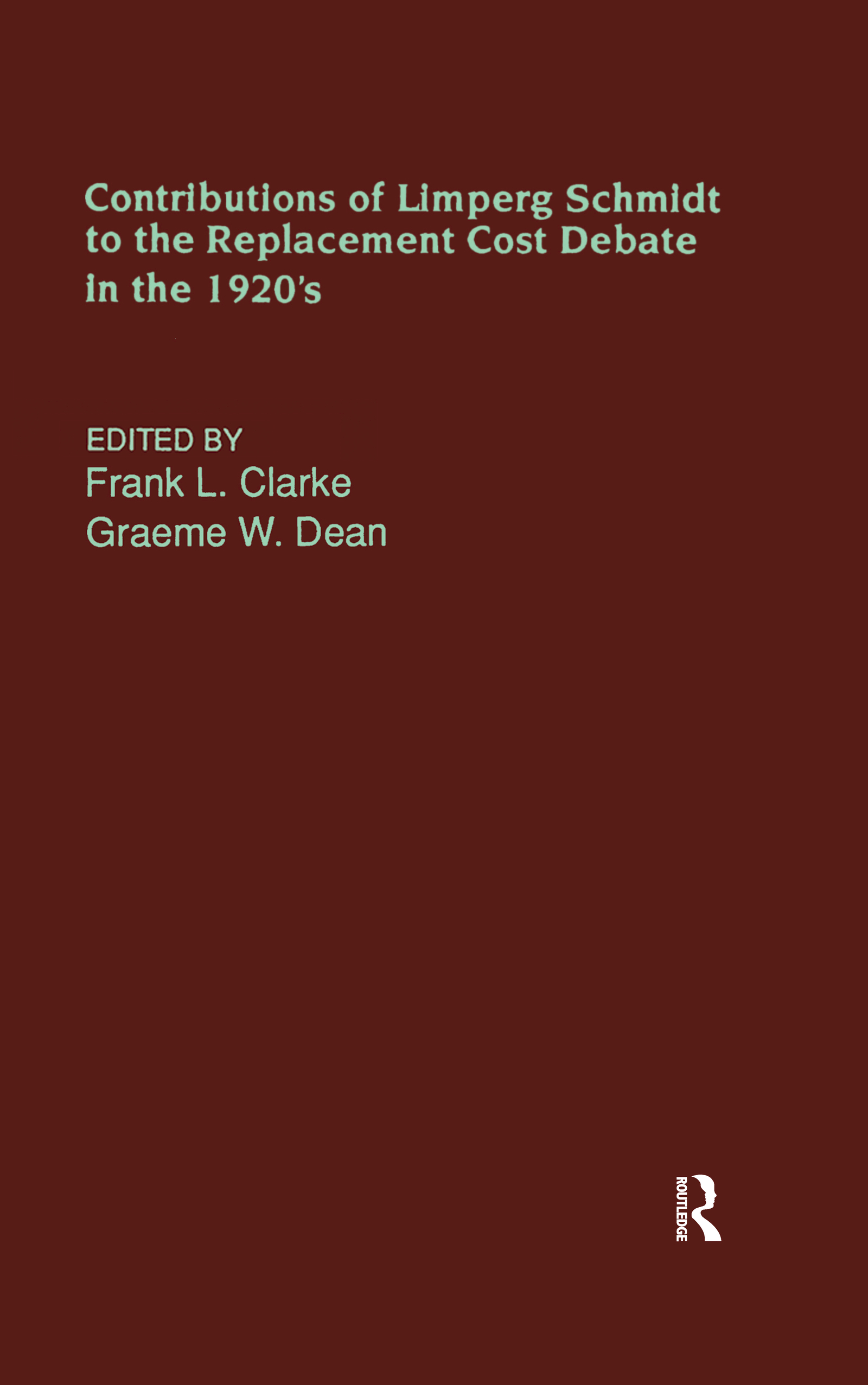 Contributions of Limperg & Schmidt to the Replacement Cost Debate in the 1920s This book, first published in 1990, examines the works of Theodore Limberg and Fritz Schmidt and their contribution to the development of the case for replacement price valuations. It analyses which of Limberg's and Schmidt's contributions was the most prominent and whether either was the genesis of an evolutionary development of replacement price valuations. This analysis is apposite. History indicates we will experience further periods of inflation and accompanying debate on the serviceability of accounting proposals to incorporate the financial effects of price and price-level changes. Business