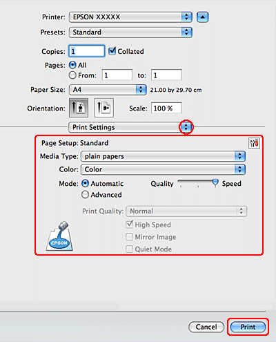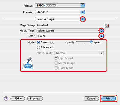 Sélectionnez les paramètres Media Type (Support), Color (Couleur) et Mode adaptés. Pour plus de détails sur l’option Print Settings (Configuration Imprimante), reportez-vous à l’aide en ligne.