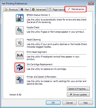 Si vous devez remplacer une cartouche d'encre avant qu'elle ne soit vide ou quasiment vide, cliquez sur le bouton dans l'onglet Maintenance (Utilitaire).