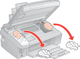 ![]() S'il reste du papier coincé à proximité du chargeur arrière ou du bac de sortie, retirez délicatement le papier.