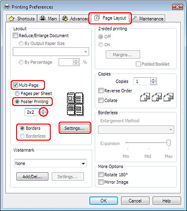 Cliquez sur l’onglet Page Layout (Disposition), sélectionnez Multi-Page (Multi-Pages), puis sélectionnez Poster Printing (Impression poster). Cliquez sur la flèche Haut ou Bas pour sélectionner 2x1, 2x2, 3x3 ou 4x4.