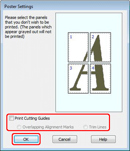Voici un exemple de création de poster pour lequel on sélectionne l’option 2x2 dans la zone Sélection poster et l’option Overlapping Alignment Marks (Guides de recouvrement) dans la zone Print Cutting Guides (Imprimer les marques de coupe).