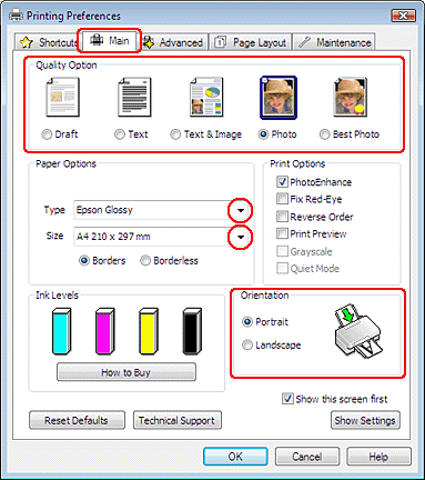 Cliquez sur l’onglet Main (Principal) et sélectionnez une des options suivantes pour la qualité Quality Option (Option Qualité) :