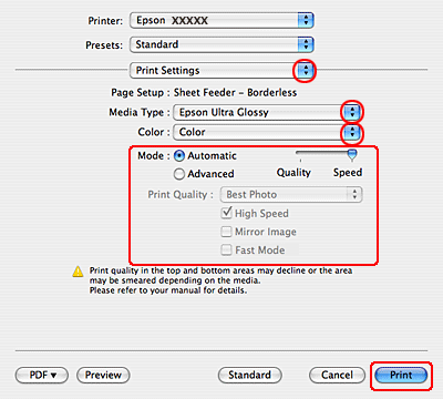 Sélectionnez les paramètres Media Type (Support), Color (Couleur) et Mode adaptés. Pour plus de détails concernant les paramètres Print Settings (Configuration Imprimante), reportez-vous à l'aide en ligne.