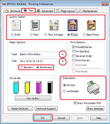 Sélectionnez l'option XXX (Sheet Feeder - Borderless) (Bac feuille à feuille - Sans marges) pour le paramètre Paper Size (Taille papier) si vous souhaitez imprimer des photos sans marges.