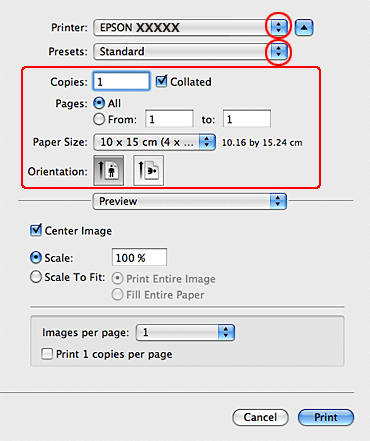 Selon l'application utilisée, il est possible que vous ne puissiez pas sélectionner certains éléments de cette zone de dialogue. Si tel est le cas, cliquez sur Page Setup (Format d'impression) dans le menu File (Fichier) de votre application et effectuez les réglages.