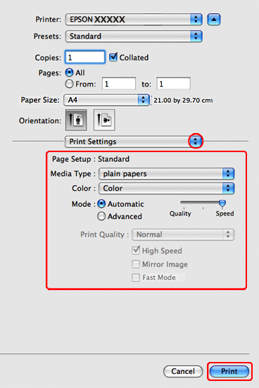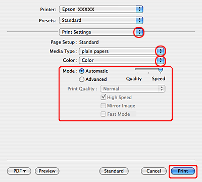 Sélectionnez les paramètres Media Type (Support), Color (Couleur) et Mode adaptés. Pour plus de détails concernant les paramètres Print Settings (Configuration Imprimante), reportez-vous à l'aide en ligne.