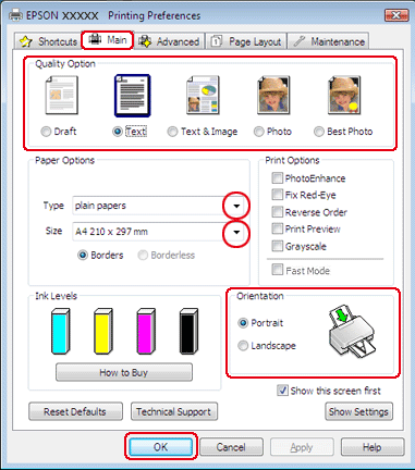 Sélectionnez les paramètres Paper Size (Taille papier) et Orientation adaptés. Vous pouvez aussi définir une taille de papier personnalisée. Pour plus de détails, reportez-vous à l'aide en ligne.