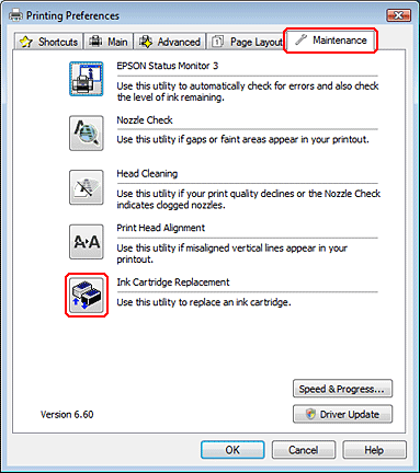 Si vous devez remplacer une cartouche d'encre avant qu'elle ne soit vide ou quasiment vide, cliquez sur le bouton dans l'onglet Maintenance (Utilitaire).