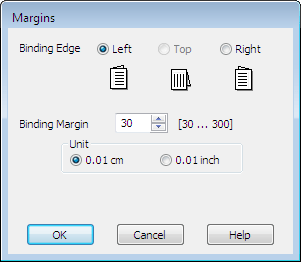 Choisissez cm ou inch (pouces) pour le paramètre Unit (Unité). Indiquez ensuite la largeur de la marge de reliure. Vous pouvez spécifier toute largeur comprise entre 0,3 cm et 3,0 cm ou entre 0,12 pouce et 1,18 pouce.