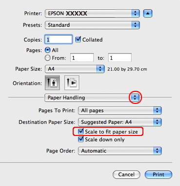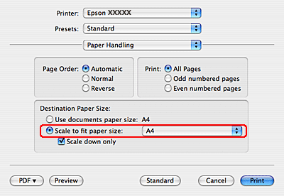 Sélectionnez l'option Scale to fit paper size (Proportion) pour le paramètre Destination Paper Size (Format papier cible).