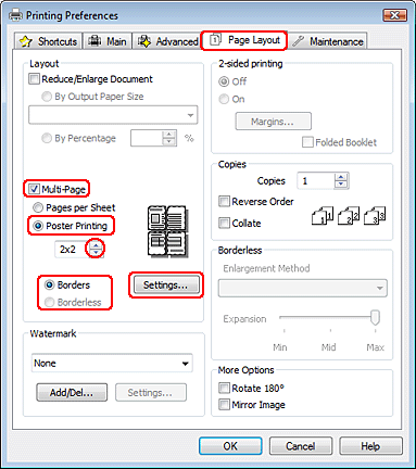 Cliquez sur l’onglet Page Layout (Disposition), sélectionnez Multi-Page (Multi-Pages), puis sélectionnez Poster Printing (Impression poster). Cliquez sur la flèche Haut ou Bas pour sélectionner 2x1, 2x2, 3x3 ou 4x4.