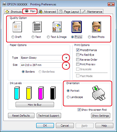 Cliquez sur l'onglet Main (Principal) et sélectionnez un des paramètres Quality Option (Option Qualité) suivants :