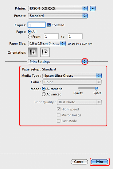 Sélectionnez les paramètres Media Type (Support), Color (Couleur) et Mode adaptés. Pour plus de détails concernant les paramètres Print Settings (Configuration Imprimante), reportez-vous à l'aide en ligne.