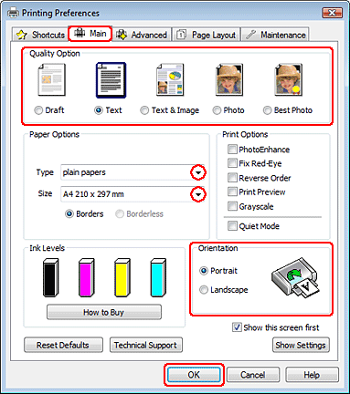 Sélectionnez les paramètres Paper Size (Taille papier) et Orientation adaptés. Vous pouvez aussi définir une taille de papier personnalisée. Pour plus de détails, reportez-vous à l'aide en ligne.