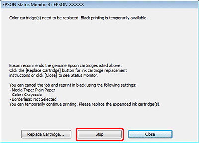 Lorsque l'application EPSON Status Monitor 3 vous demande d'annuler le travail d'impression, cliquez sur Stop ou Cancel Print (Annuler impression) pour annuler le travail d'impression.