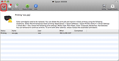 Si vous ne pouvez pas reprendre l'impression, cliquez sur l'icône de l'imprimante dans le Dock. Si un message d'erreur vous invitant à annuler le travail d'impression s'affiche, cliquez sur Delete (Effacer) et procédez comme suit pour réimprimer le document avec de l'encre noire.