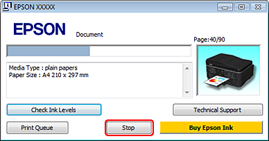 Vous pouvez afficher le Windows Spooler (Spouleur Windows) en cliquant sur Print Queue (File d'attente). Pour Mac OS XUtilisation de EPSON Status MonitorSi EPSON Status Monitor détecte un problème au niveau de l'imprimante, il le signale par un message d'erreur.