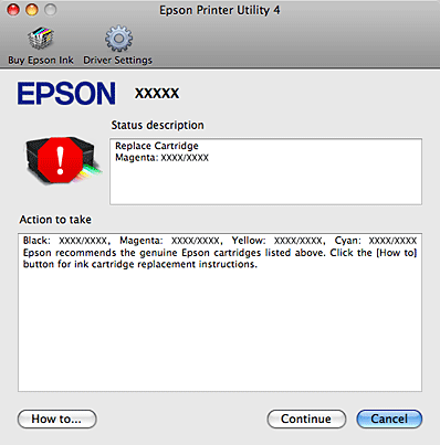 ![]() Quand il n’y a presque plus d’encre ou que la cartouche est épuisée, un bouton How to (Comment faire) apparaît. Cliquez sur How to (Comment faire) et l'utilitaire EPSON Status Monitor vous guidera pas à pas tout au long de la procédure de remplacement de la cartouche.