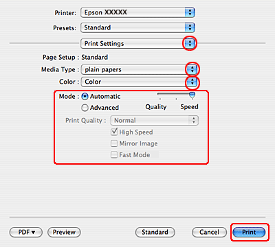Sélectionnez les paramètres Media Type (Support), Color (Couleur) et Mode adaptés. Pour plus de détails concernant les paramètres Print Settings (Configuration Imprimante), reportez-vous à l'aide en ligne.