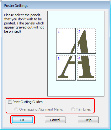 Voici un exemple de création de poster pour lequel on sélectionne l'option 2x2 dans la zone Impression poster et l'option Overlapping Alignment Marks (Guides de recouvrement) dans la zone Print Cutting Guides (Imprimer les marques de coupe).